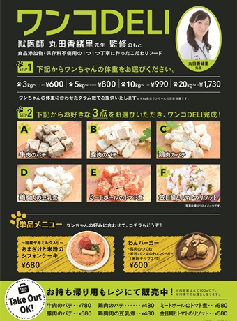 また獣医師監修のワンちゃん専用メニューがあり、食品添加物・保存料不使用で、店内で1つ1つ丁寧に手作りされたもの。テイクアウトも可能ですよ。