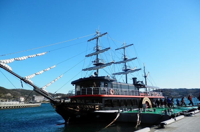 下田港から出る遊覧船 黒船「サスケハナ」に乗り、下田の港を周遊します。所要時間はおよそ20分。毎日運航しています。