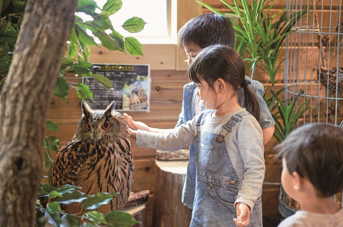 吊橋を渡った先にある「ふろっく 福時計」。フクロウ、ハリネズミ、ミーアキャットなど珍しい小動物とふれ合える人気の施設です。動物たちを近くで観察できるほか、手で撫でたり抱っこしたり、一緒に写真撮影もできます。